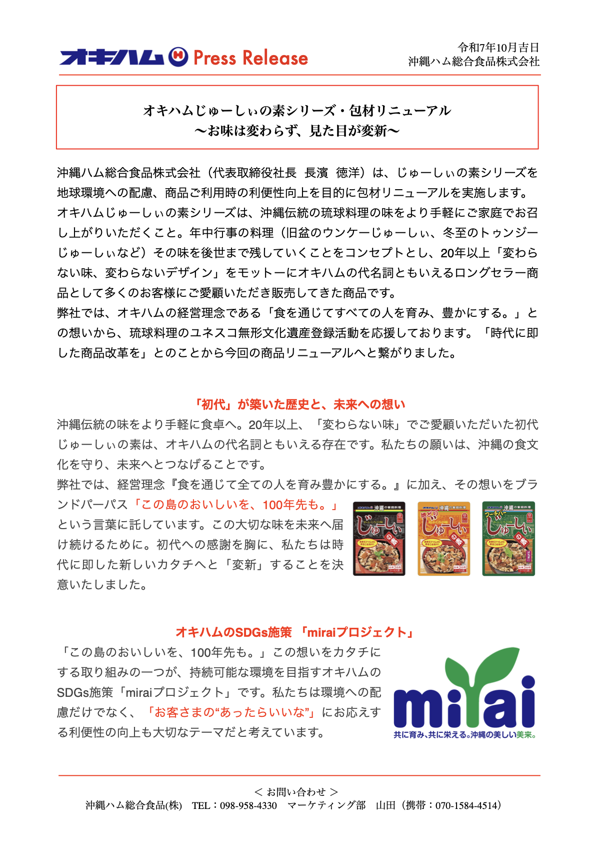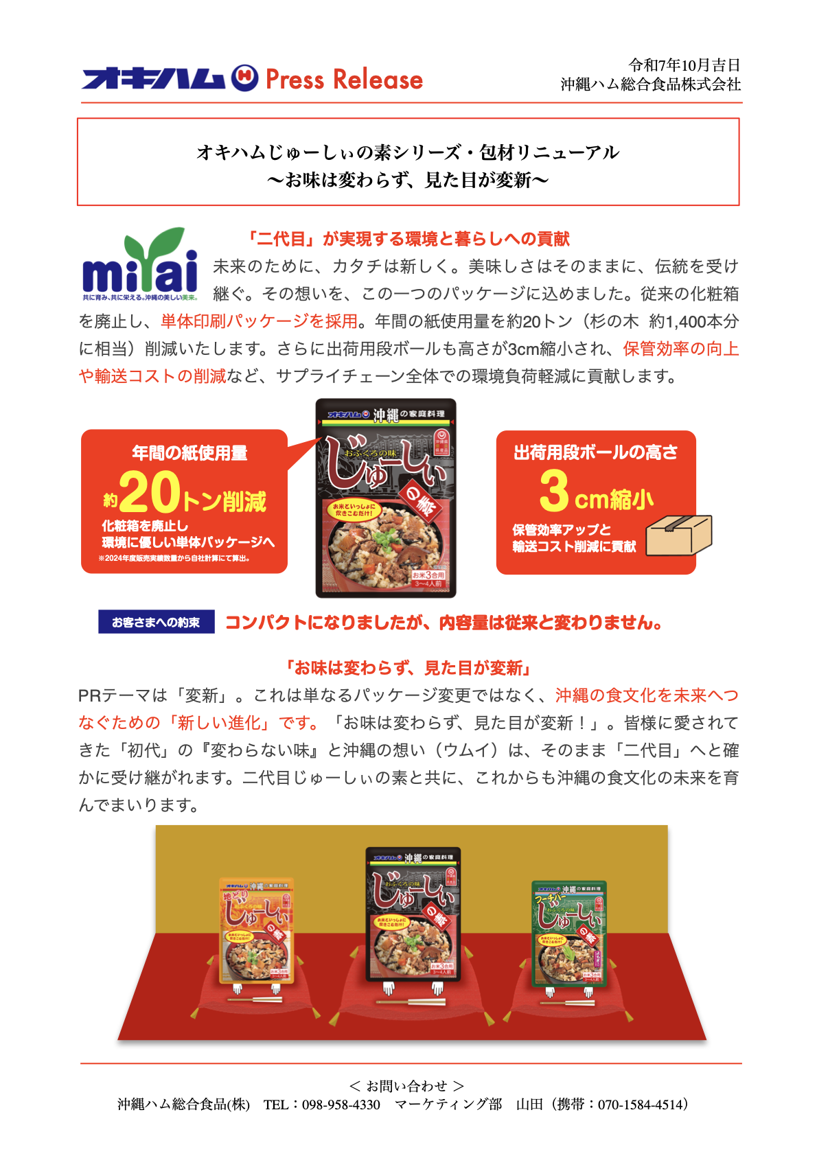 オキハムじゅーしぃの素シリーズ・包材リニューアル オキハム2025-10-02T19:47:52+00:002025/10/02|Categories: お知らせ| この記事をシェアする! FacebookTwitter Related Posts 真心島の贈り物~2025年お中元ギフトのご案内 2025/06/17 オキハム工場見学通路リニューアルオープンのお知らせ 2025/05/02 【出店情報】よみたん夜市(3/29、30) 2025/03/27 【出店情報】中日ドラゴンズファン感謝イベント「りっかりっか いちゃびら祭」 2025/02/06 2024年お歳暮ハムギフトのご紹介 2024/12/06